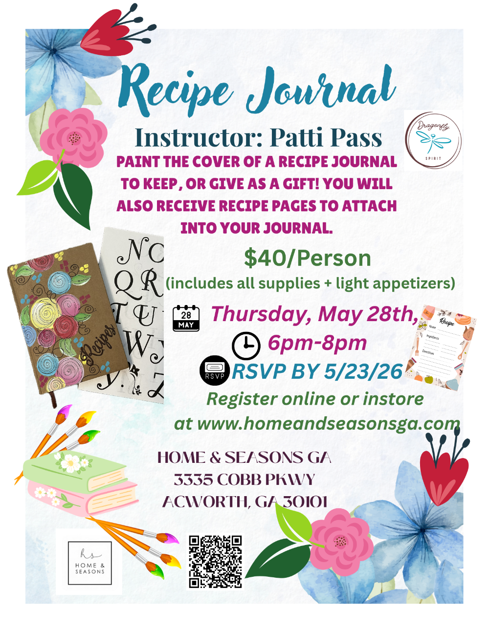 Paint the cover of a Kraft Journal with Patti Pass of Dragonfly Spirit. May 28th, 6pm-8pm, all supplies included, plus light snacks/drinks. No painting experience required! RSVP by May 23rd. (**Option: Make this just a generic journal with your Inital on the front vs a Recipe journal)