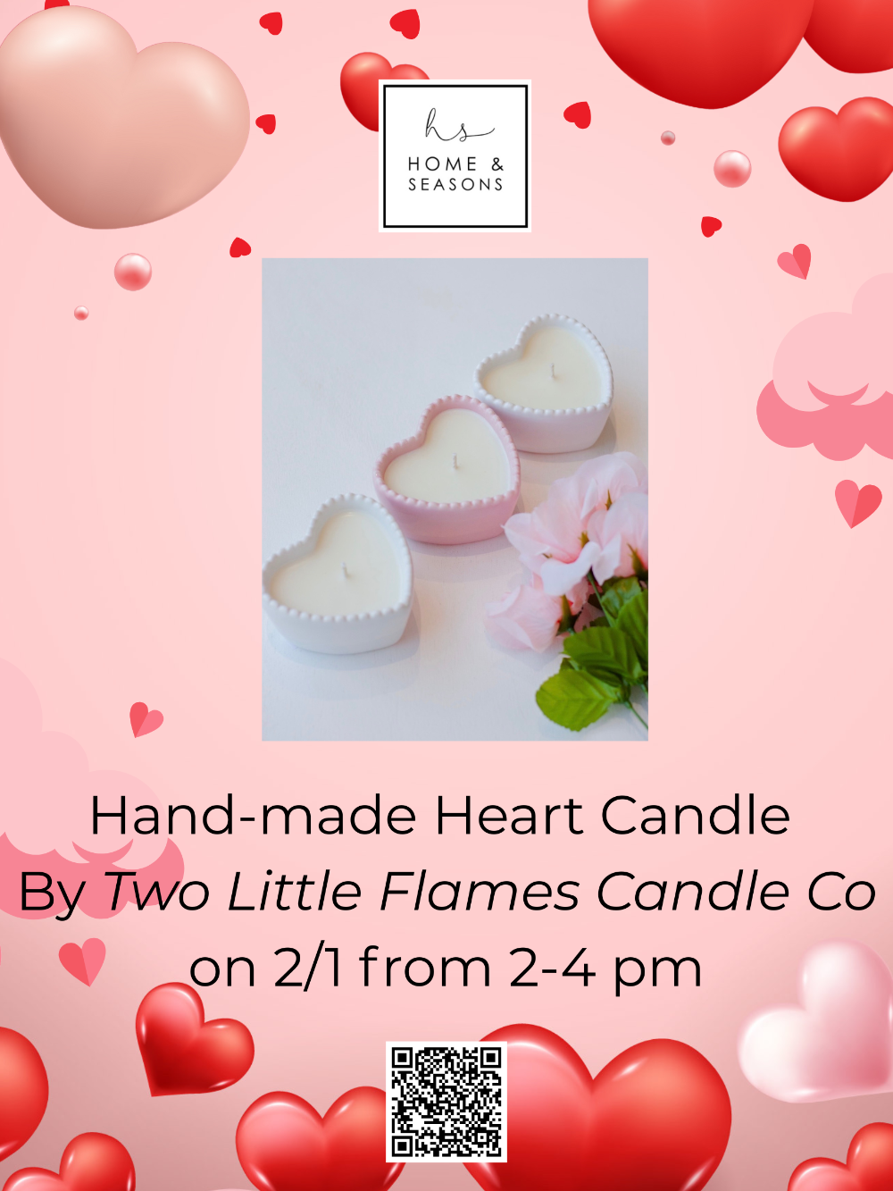 Hand-made Heart Candle Class with Lisa Bueker with Two Little Flames Candle Co. $40 includes a soy wax candle with opportunity to mix a custom fragrance! Register online at homeandseasonsga.com, or scan QR code.