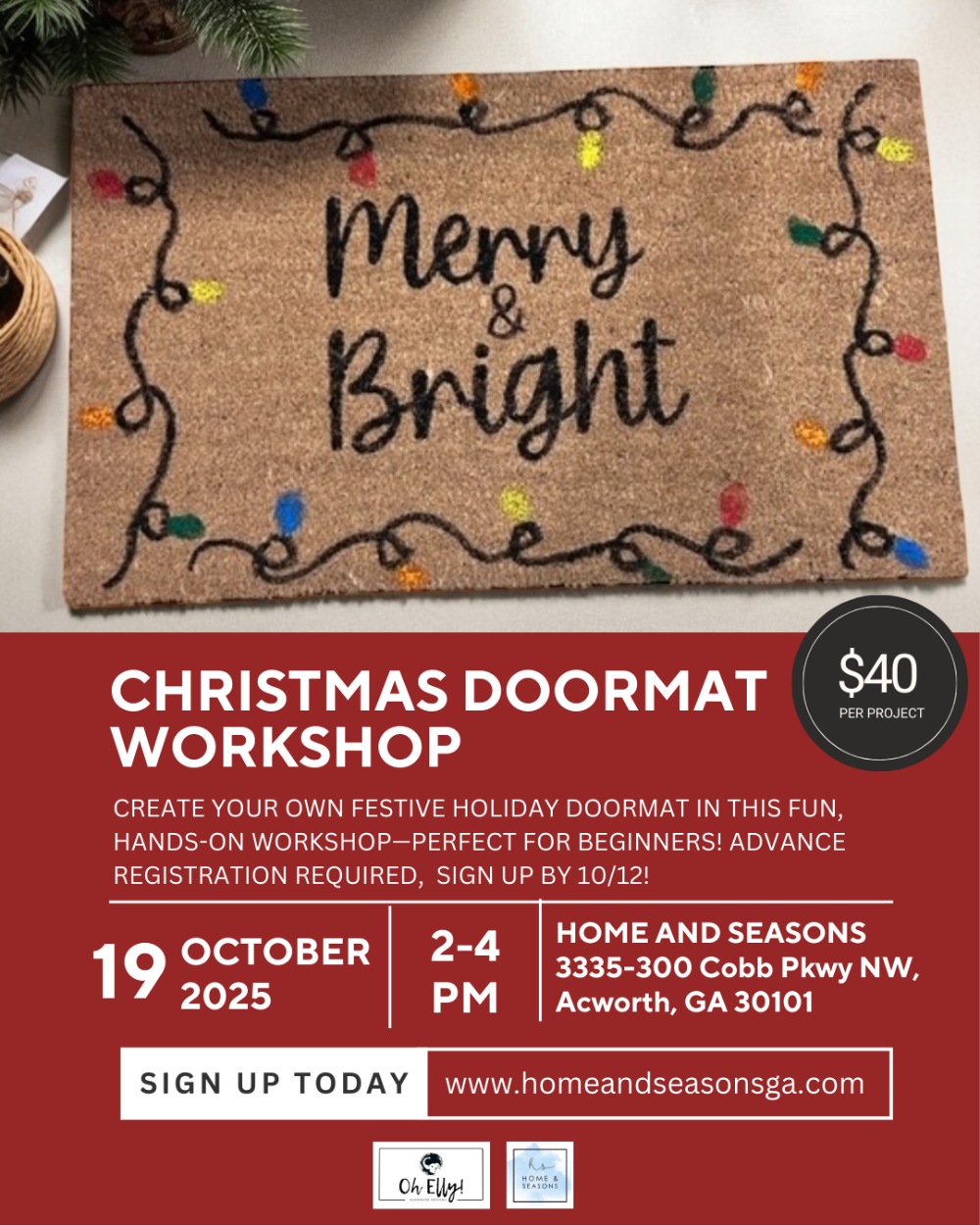 Oh Elly Designs is back with another fantastic class! Design and paint your own customized Holiday Doormat size 18x30. All supplies included. October 19th 2-4 pm