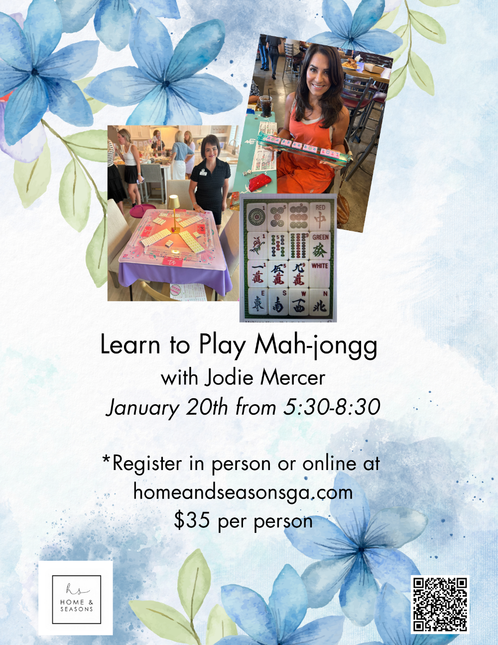 Come join us and learn from the best! Jodie Mercer will teach you how to play mah-jongg. This class is sure to sell out so grab some friends and register in store or online at homeandseasonsga.com.